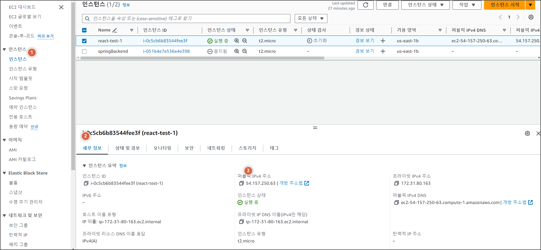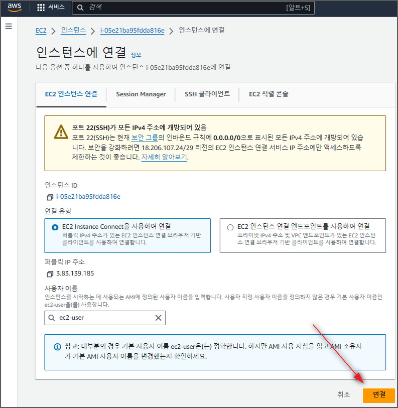 위 코드까지 진행 후 해당 주소로 들어가면 사이트에 접속되지 않는다 그래서 아래와 같이 인스턴스 세부정보에서