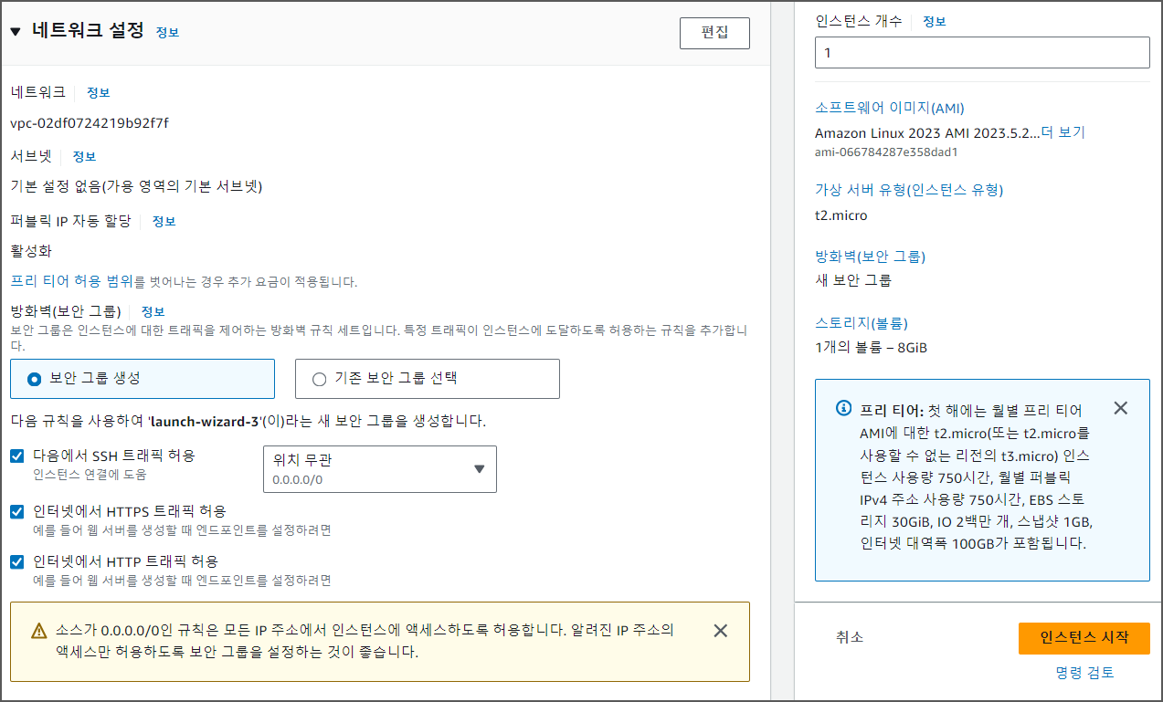 위와 같이 네트워크 설정을 체크한 후 우측하단 '인스턴스 시작' 메뉴를 클릭한다!