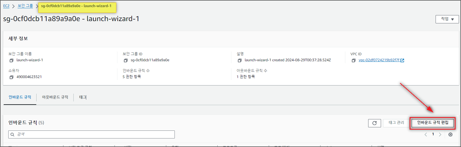 위와 같이 인스턴스 > 보안 > 보안그룹 내 링크화된 샬랴샬랴된 암호화된 글씨 클릭 한다!